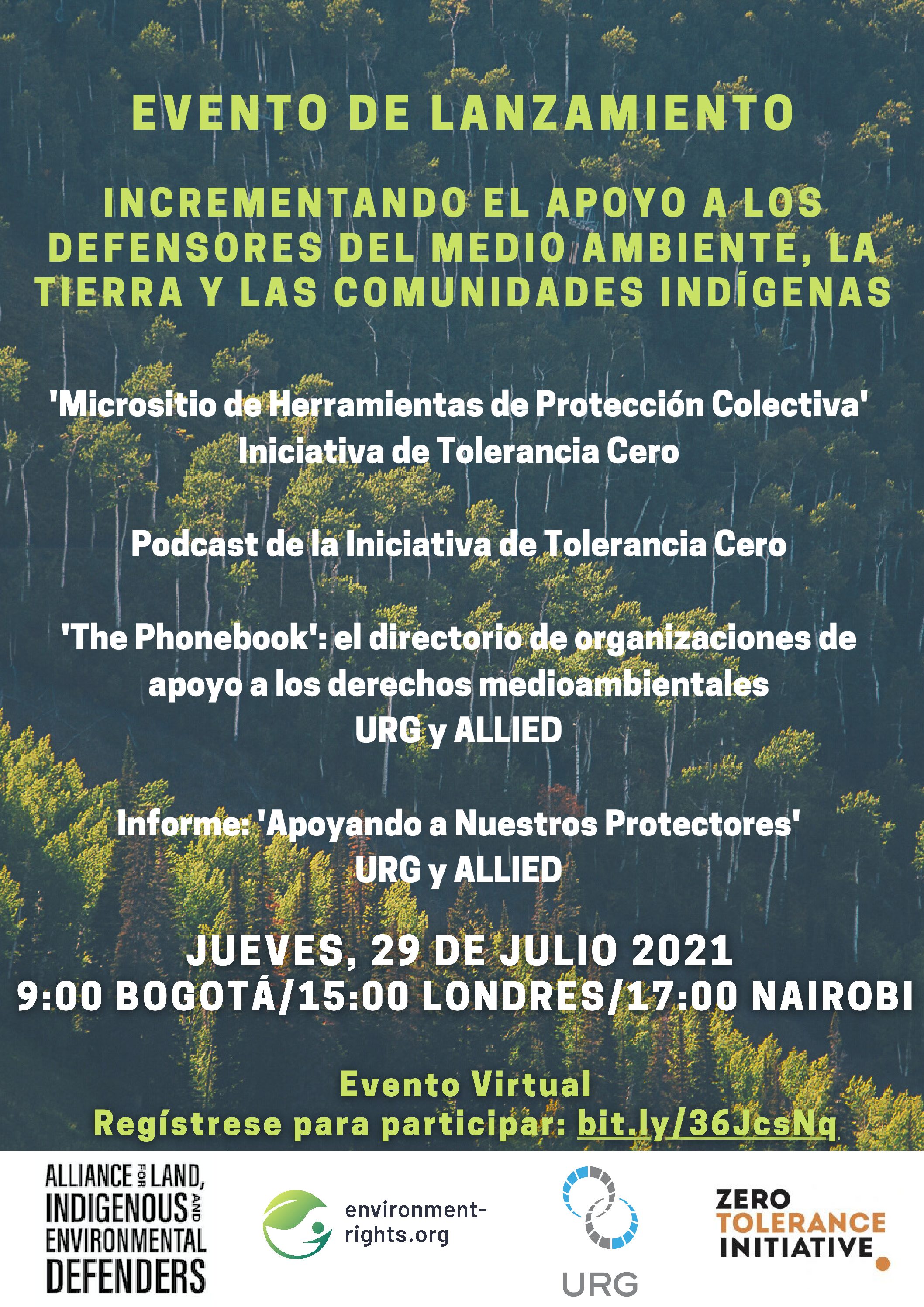 El evento está co-organizado con la Iniciativa de Tolerancia Zero (ZTI), quienes lanzarán su nuevo Micrositio de herramientas didácticas de protección colectiva ; una bibliotecha de más de 100 informes, videos, guías, y otros materiales de entrenamiento sobre mejores prácticas para proteger efectivamente a las personas defensoras de la tierra y el territorio, sus comunidades y sis tierras.