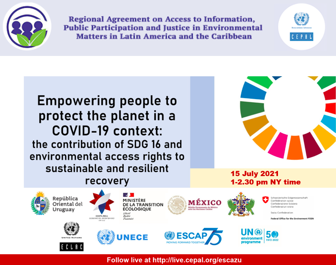 We invite you to follow live the event “Empowering people to protect the planet in a COVID-19 context: the contribution of SDG 16 and environmental access rights to sustainable and resilient recovery” taking place tomorrow Thursday, 15 July 2021 starting at 1pm New York time.
