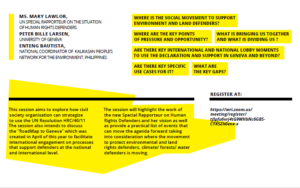 The Defending Land and Environmental Defenders Coalition invites you to attend a dialogue to discuss the Implementation of the Human Rights Council Resolution A/HRC/ 40/ and the Geneva Road Map with our distinguished speakers