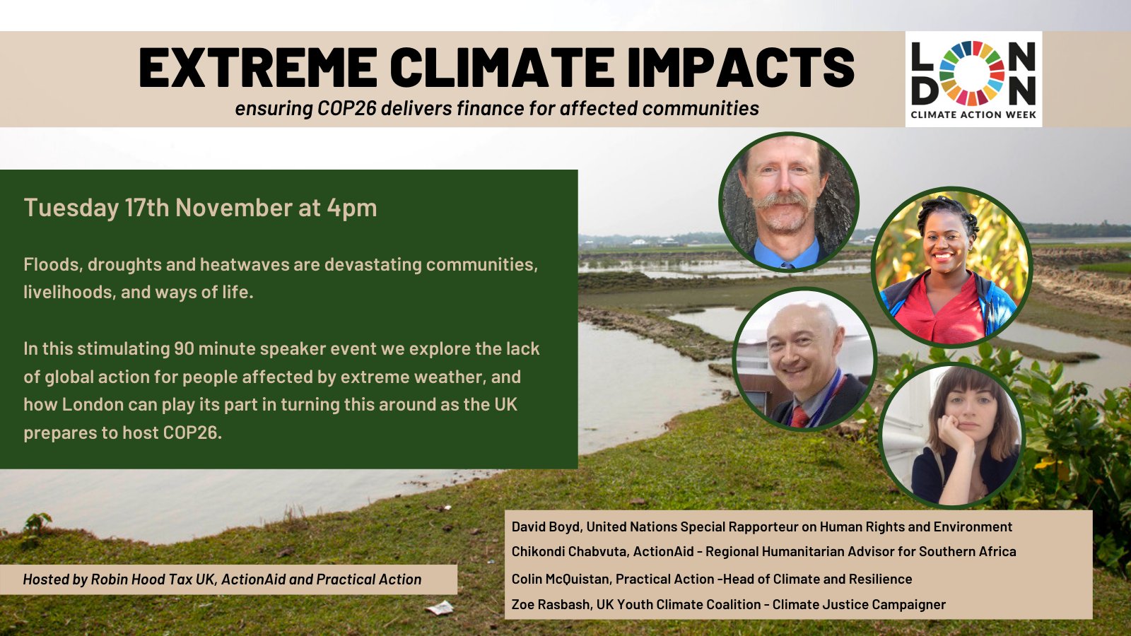 In this stimulating 90 minute speaker event co-organised by ActionAid, Practical Action and the Robin Hood Tax Campaign UK, we explore the lack of global action for people affected by extreme weather, and how London can play its part in turning this around as the UK prepares to host COP26.