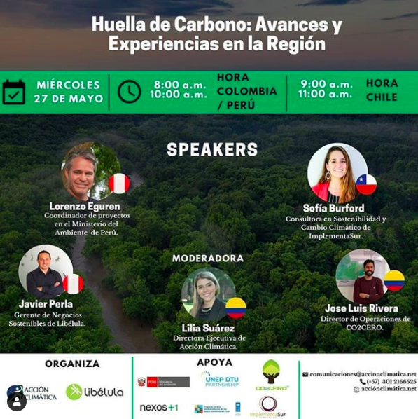 webinar “Huella de Carbono: Avances y Experiencias en la Región”, evento online que contará con la participación de los expositores Lorenzo Eguren, Coordinador de proyectos en el Ministerio de Ambiente de Perú, Javier Perla, Gerente de Negocios Sostenibles de Libélula, Sofía Burford, Consultora en Sostenibilidad y Cambio Climático de ImplementaSur y Jose Luis Rivera, Director de Operaciones de co2cero.