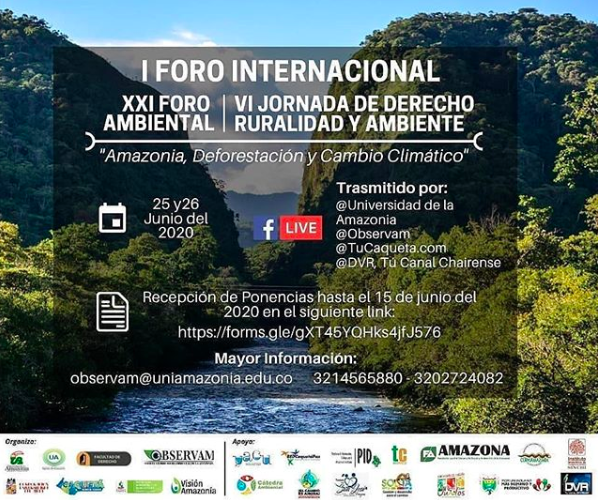 En el marco del día internacional de la preservación de los bosques tropicales, la Universidad de la Amazonia, la Fundación Universitaria Agraria de Colombia “UNIAGRARIA”, Corporación Universitaria del Meta “UNIMETA” y Visión Amazonia desarrollaran el I FORO INTERNACIONAL, XXI FORO AMBIENTAL y la VI JORNADA DE DERECHO RURALIDAD Y AMBIENTE “Amazonia, Deforestación y Cambio Climático”, el cual se realizará los días 25 y 26 de junio del 2020, en horario de 8:00 am a 12 m y de 2:00 a 6:00 pm de manera virtual y será transmitido por @Universidad de la Amazonia, @Observam, @TuCaquetá.com, @DVR Tu Canal Chairense.