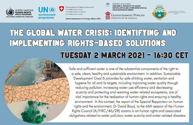 Safe and sufficient water is one of the substantive components of the right to a safe, clean, healthy and sustainable environment. In addition, Sustainable Development Goal 6, provides for safe drinking water, sanitation and hygiene for all and its targets, including improving water quality through reducing pollution, increasing water-use efficiency and decreasing scarcity and protecting and restoring water-related ecosystems, are of vital importance for the realisation of human rights and ensuring a healthy environment. In this context, the report of the Special Rapporteur on human rights and the environment, Dr David Boyd, to the 46th session of the Human Rights Council (A/HRC/46/28) zooms in on human rights and associated obligations related to water pollution, water scarcity and water-related disasters.